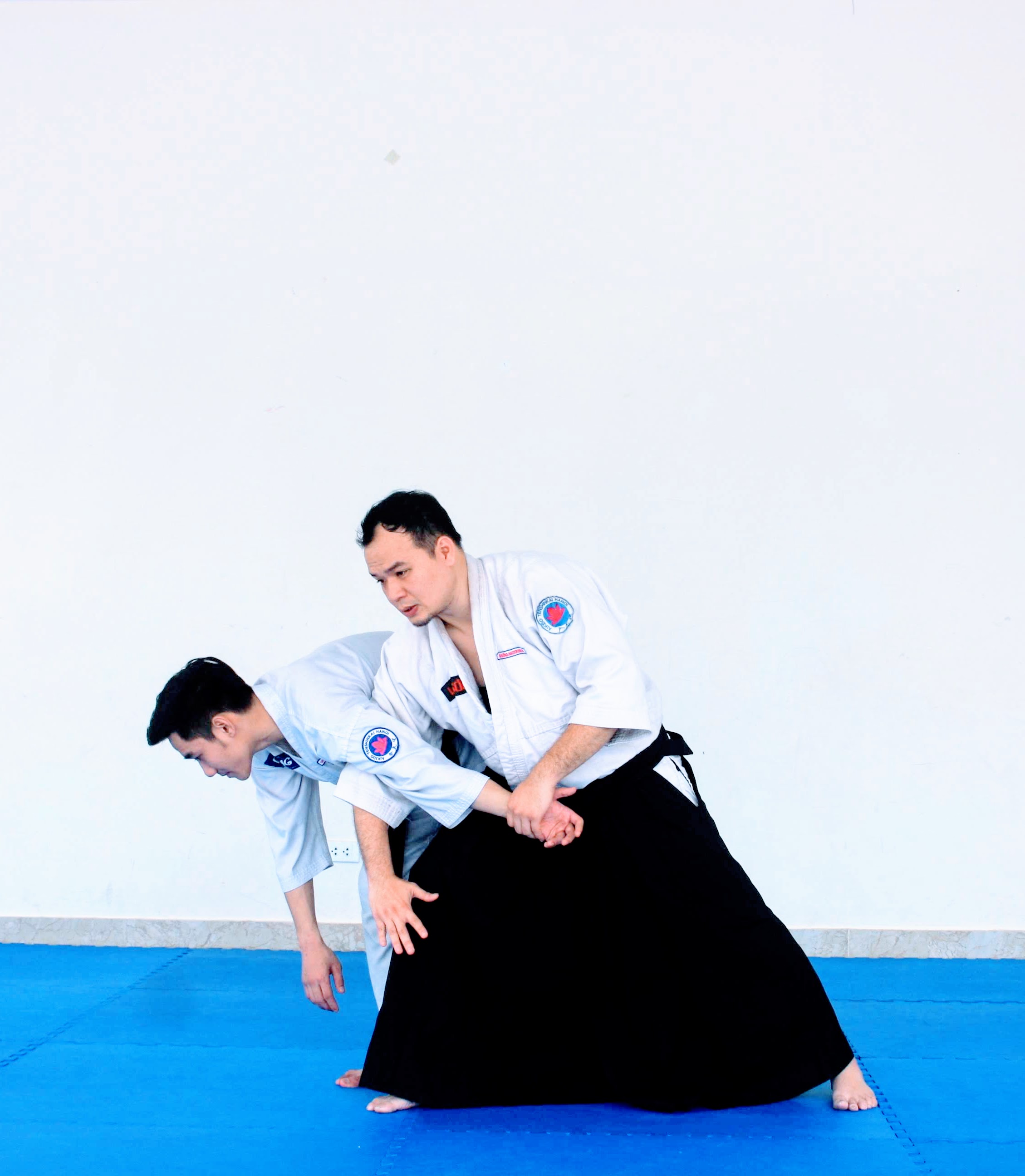 Trong Aikido tuy chủ đạo hướng về phòng thủ nhưng luôn chuyển từ thế thủ sang công để vô hiệu hóa đối phương chứ không co cụm chống đỡ.